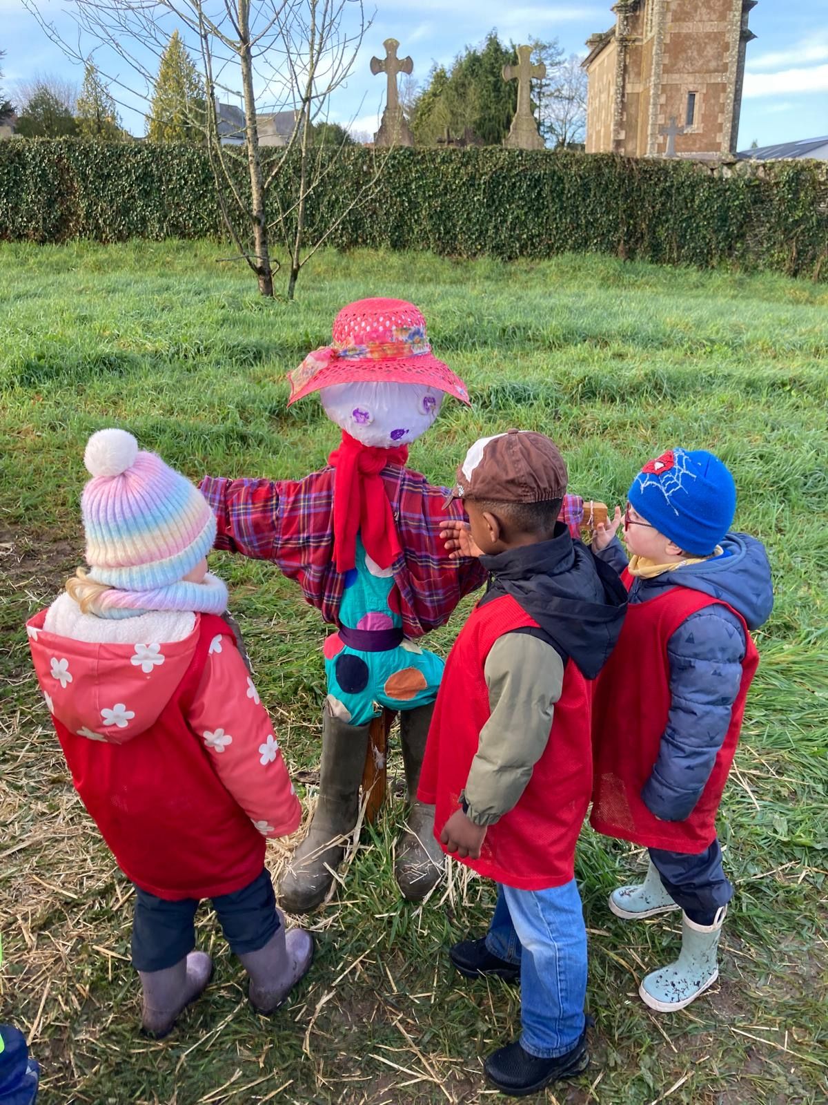 Moment fort de la matinĂ©e : lâĂ©pouvantail, rĂ©alisĂ© collectivement, a Ă©tĂ© baptisĂ© « Bibi » par les enfants đ.